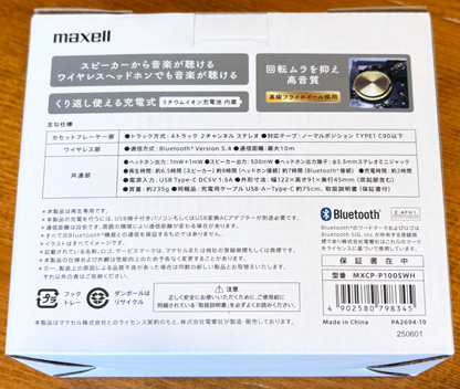 さらに、ニュースリリースによると、 「電響社は、長年愛されるマクセルブランドのカセットテープ関連の製品を開発・販売することで、新たにカセットテープに興味を持ち始めた方々にその魅力と価値を伝えながら、カセットテープ文化のさらなる発展に貢献してまいります。」 なんと素晴らしい!!! 今回発売されたプレーヤーは「カセットテープ文化のさらなる発展」のために「maxell」ブランドのコンシューマー向け製品の一つとして、電響社が企画開発して発売したものなのだ。 カセットを愛する博物館の館長として、これは感極まって泣けるほど嬉しい話である。 今回リポートするのは「MXCP-P100S」という型番の製品で、今年(2025年)8月20日に発売されたものである。 実は、先の5月に「MXCP-P100」という製品が既に発売されており、「P100S」はmaxellのカセットプレーヤーとしては第2弾目の製品となる。 「P100」との違いはスピーカーが付いたことで、これによりヘッドホンをつながなくても音が聴けるため、カセットのちょい聴きをしたり、多人数でカセットを聴くということができるようなり、便利に使えるようになった。 「P100」の方は発売後に一時売り切れになるほどの人気ぶりで、館長はタイミング悪く入手できなかったのだが、「P100S」が発売されたことを聞きつけて早速購入したという次第である。 前置きが長くなったが、それではリポートを始めることにしよう。 まずは開封場面から(笑)。 |