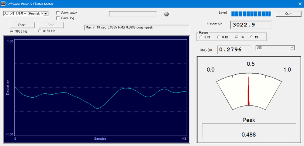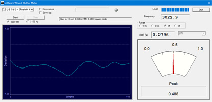 なんと8kHzあたりから激落ちしている。10kHz付近で10dBほど下がり、それ以上はほぼ壊滅状態である。 せめて10kHzくらいまではある程度の特性がほしいところだが・・・。 また、全体的にフラットな特性ではなく、1kHz以下はダラ下がりで、1〜8kHzがカマボコ状になっている。 最も聞こえやすい帯域を重視しているのかもしれないが、会議録音用ならともかく、音楽鑑賞用としてはちょっと残念な特性だ。 まあ、この特性でフラットにすると物足りない音になってしまうかもしれないので、パンチが感じられるような音づくりを敢えてしているのかもしれない。 それでは次にワウフラの測定。 測定にはSONY製テストテープ「WS-48A」(3kHz)を使用した。ワウフラメーターは持っていないので、パソコンのソフトにて測定する。 |
