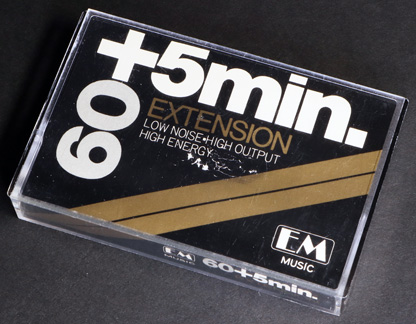 「スワイヤ・マグネティックス・ジャパン・リミテッド」という会社が販売していたスーパーLHタイプのカセットである。 製造元である「SWIRE MAGNETICS LTD.」は香港にある会社だったようである。 パッケージに「+5min.」と大書きされているとおり、録音可能時間が5分長い(C-60タイプで往復65分)ことが特徴で、「+5シリーズ」として本製品を含めて3グレードの製品が展開されており、この「EM」タイプはその最上位にあたる音楽録音用のカセットとなっている。 通常のカセットでも、テレコの速度偏差に対応するため、片面当たり1分程度は余裕を持たせたテープの長さにしていることが多いが、「+5シリーズ」は片面当たり2分30秒(テープの長さとしては約7.1m)と、かなり長めの余裕になっている。 最上位製品ではあるが、価格の方は国内メーカーのLHタイプ相当であった。 カセット本体はブラックのハーフに格子縞のエンボス加工がされており、見た目が「Precision cassette half」タイプのTDK「SA」とそっくりで高級感がある。 また、プラスチックケースの方にもTDK製品と同様に格子模様が入っているが、当時のTDK製品とは異なり全体が透明部材で構成されている。 |