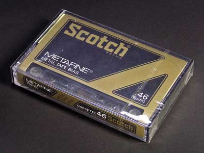 世界初のメタルテープである。 磁性体にファインメタル(酸化していない金属微粉)を使用することにより、保磁力、残留磁束密度ともにクロムポジションテープの約2倍という高性能化が可能となった。 「クロムポジションカセットに較べ、MOL(最大出力レベル)は中低域で約4dB、高域で約10dBアップ。カセットでオープンリール19cm/s・4TRに匹敵する音質。もはやカセットにあらず。」(当時のパンフレットより) あまりに強力な磁性体のため、メタルポジションを持たない従来のカセットデッキではヘッド等の能力が追いつかず、まともには録音や消去ができないというほどの代物であった。 価格についても、当時最も高価格であったフェリクロムタイプがC46で650〜850円だったのに対し、このテープは同じC46で1,350円と破格であった。 カセット本体には、Masterでも採用されたラベルの貼り替えができる「精密クリスタルハーフ」が使われており、すっきりとした印象である。 パッケージデザインはブラックとゴールドが使われ豪華な印象だが、世界初という気負った派手さは感じられない。 1978年12月の発売以降久しくC-46のみの販売であったが、1980年になってC-60及びC-90が発売された。 1980年と1982年に価格引き下げはあったものの製品自体に大きな変更は行われないまま、1983年頃にはカタログから姿を消している。結局、日本で販売された「Scotch」ブランドのメタルテープはこの「METAFINE」のみとなった。(海外ではリニューアルされた製品が販売されていた。) 本製品発売をきっかけとして、翌年の1979年には他のメーカーからも次々とメタルテープが発売され、また、対応デッキの品揃えも進み、カセット録音の一層の高音質化が進むこととなった。 |