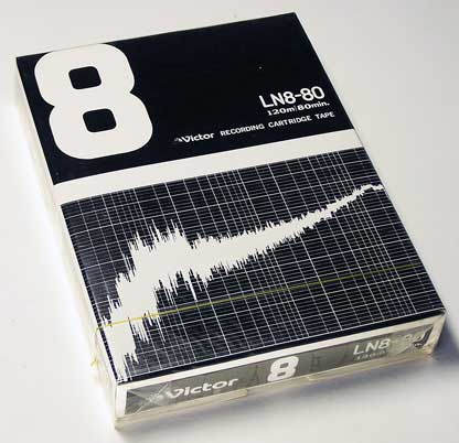 Victor(日本ビクター)が販売した録音用8トラックカートリッジ生テープである。 パッケージは、当時の同社カセットテープと同様の周波数特性グラフのようなデザインが使われており、白黒印刷となっている。 画像の製品は、80分(20分×4)の録音ができる8トラックテープとしては長尺物で、他に40分用、60分用のラインナップがあった。 |