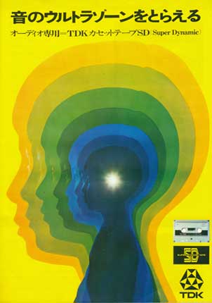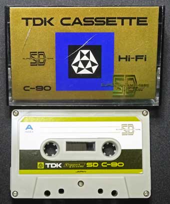 初回からいきなりマニアックなタイトルで恐縮であるが、当博物館の学芸部はこんなものであるのでご容赦いただきたい(笑)。 TDKの「初代SD」はこちらでも紹介しているとおり、カセット初の音楽専用テープとされているもので、LHタイプの先駆けとなった製品である。 「SD」は、磁性粉を微細、均一化することによって物理特性を向上させ、また、バインダーも改良して化学的な安定性やテープ表面の平滑性を高めるなど、カセットテープの性能を飛躍的に向上させた製品であった。 当時のパンフレットによると、 「現在市販されているカセットの10,000Hzラインに対し、20,000Hzラインを可能にしました。」 「12,000Hzで+4dB以上と高音の伸びが非常にすぐれ、・・・驚異の超高音響テープです。」 「オープンテープに匹敵するHi-Fi録音が可能です。」 などと、何やら凄いことが書いてある(笑)。 |
