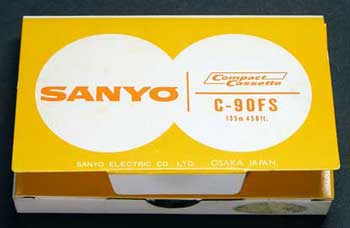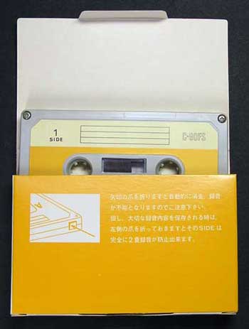 この箱の開け口は長辺方向になっており、上下両方にフタが付いている。 この方がカセットを取り出しやすいが、紙の接着部分が短辺方向だけになるので、箱としての強度や耐久性に難があるのではないかと思われる(笑)。 続いて、ちょっと変わったタイプを紹介する。 |