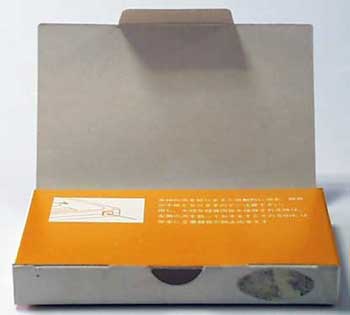 これも長辺方向が開け口なのだが、フタが特大で、パッケージの一面を丸々覆うようになっている。 閉めるときは、開け口の反対側の長辺部分にある溝にタブを挟んで止めるようになっている。 これなら、箱としての強度も保てるだろう(笑)。 フタで隠れる部分には注意書きなどを記載することもできる。 このタイプは、1970年代初頭の複数メーカーの初期の製品で見ることができる。 |