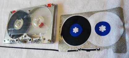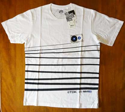 シャツの中央部分の横線はカセット本体から引き出されたテープを表しているようだが、実際のテープがこんなことになったら悲惨だ。 特に「MA−R」のような高価なテープがデッキの中で絡まった挙げ句に、こんな状態で出てきたら泣いてしまうかも(笑)。 シャツの裏側が真っ白で寂しいので、本物を置いてみた。 |