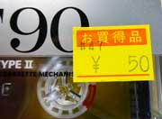 さて、それでは実技に入ることにする。 今回は、この「TDK SF」の右上に貼られている黄色い値札シールを剥がしてみることにしよう。 カセット末期の長期在庫投げ売り時のものか、「50円」という屈辱的な価格の値札である(笑)。 |