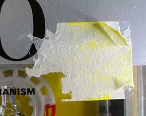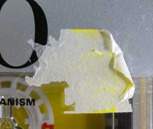 シールの隅が持ち上がり、接着剤の固化も見られないようであれば、シール全体を剥がすことができる可能性が高いので、持ち上がった隅の部分を上に引っ張りながら、ゆっくりと剥がせるところまで剥がしてみる。 運が良ければ、これでかなりの部分をきれいに剥がすことができるが、シュリンクに負担が掛かる作業なので、決して無理をしてはいけない。 剥がしている途中でシールが切れてしまったら、深追いせずに別の隅の方からあらためて試してみる。 きれいに剥がす必要はない。シールの紙の部分が少しでも剥がせれば良しとする。 とにかく、シュリンクを痛めない範囲で、できるだけ取り除くことができればよい。 |
