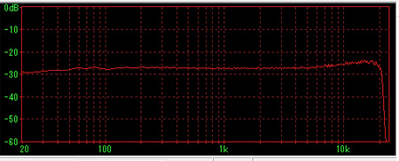 ややハイ上がり気味だが、20kHzまでクリアしている。 サンプル版はもっとフラットだったかなと思うが、もちろんこの特性はなかなかのものである。 次に、0デシベルでの録再結果はつぎのとおり。 |