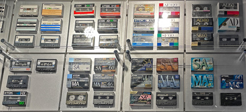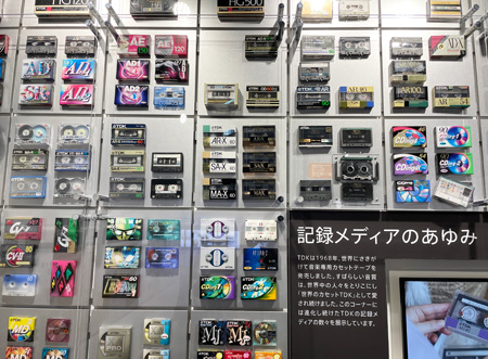 順路では、最初が「歴史ゾーン」となっている。 早速、カセットテープの展示コーナーへ突進(笑)。 カセットだけではなく「記録メディアのあゆみ」という括りでの展示になっている。 |