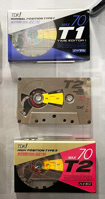 ↑ 磁気テープはTDKを代表する民生用の製品だった。それを扱うテープデッキなどのオーディオ機器が展示されている。 上の写真中央は、オープンデッキ華やかなりし時代のSONYベストセラー機「TC-6360A」。その向こうのカセットデッキはVictorのメタル対応戦略機「KD-A5」か。どちらも時代を象徴するデッキだ。(レコードプレーヤーはTechnics「SL-3350」?) 写真では見えないが、さらにその向こうには初代ウォークマン「TPS-L2」が何と動作する状態で展示されていた。OBの方が修理して稼働させたとのことだ。もちろん2つのヘッドホンで同時に聴ける。館長も試聴させてもらったが、懐かしい音の響きだった。 |