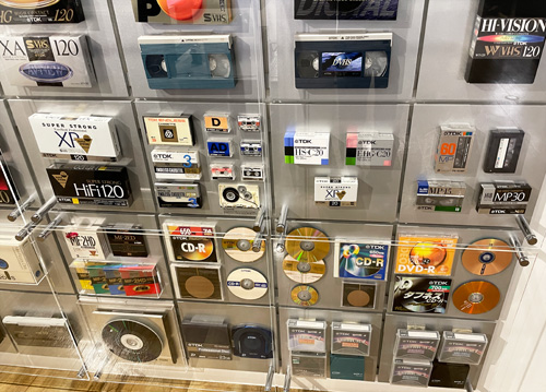 左のリールに巻かれたエンドレステープは、リールの中心部から引き出されて外周に戻ってくる。 右のリールはエンドレスの機構に関係ないのだが、ほとんどのデッキやテレコは右のリールが適度に回転していないとオートストップが働いてしまうため、右のリールを回転させる仕組みが組み込まれている。 記録メディアの展示はカセットだけではない。 ビデオカセットやCD-Rなども展示されている。 |