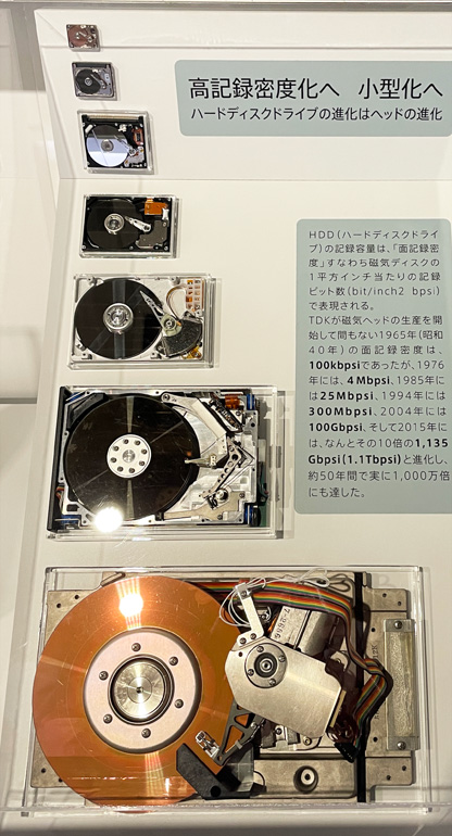 ↑ TDKはハードディスク用のヘッドも製造している。 1965年に100kbpsi(bpsi=ビット/平方インチ)だった記録密度は、技術の進歩により50年後の2015年には1.1Tbpsiと1000万倍になった。 そう言えば、初期のノートパソコンのハードディスクは数十メガバイトしかなかった。 |