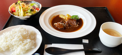 その施設というのは、「TDK ゲストハウス」というレストランである。 TDKの社用施設をランチタイムのみ一般開放しているということのようだ。 ウェブサイトで見ると、食材には地元産品が使われ大変美味しそうだし、雰囲気は高級レストランのようである。それにもかかわらずとてもお手頃なお値段となっている! つまり、このレストランも地元貢献の一つなのだろう。 その意気やよし! これは協力しない訳にはいかない。ということで館長も利用させていただくことにした(笑)。 ゲストハウスはセキュリティエリア内にあるため、利用するには受付で申込みを行い、案内してもらう必要がある。 ランチタイムのみなので営業時間は11〜15時、ラストオーダーが14時と早めになっている。 時間ギリギリだったが、なんとか利用させていただくことができた。 館長が注文したのは地元由利牛を使った「赤ワイン煮込み」。これで820円(税込)は安い! ↓ |