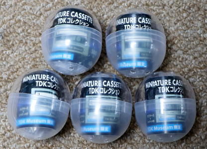 TDKのカセットテープのミニチュアがカプセルに入っているガチャガチャである。 入っているのは「TDK 歴史みらい館」限定品の「Synchro Cassette」「D」「AD」の3種類のうちいずれか1つで、1回500円となっている。 館長は5回やってみた。・・・・・その結果は後ほど(笑)。 |