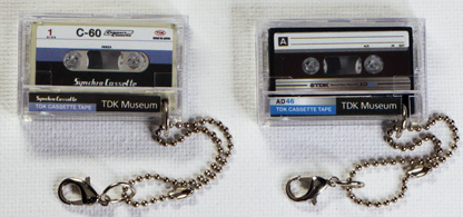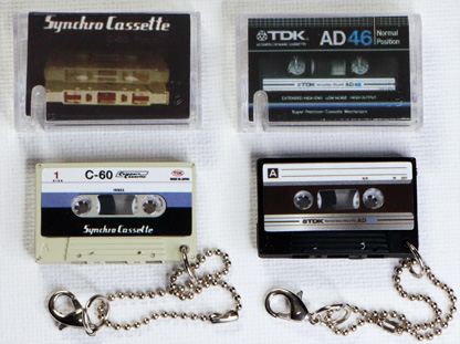 「Synchro Cassette」(写真左)が4つ、「AD」(写真右)が1つという結果であった。 それぞれ、細部までよく再現されていて本物そっくり。 チェーンはカセット本体に取り付けるが、カセットをケースに入れた状態でもチェーンが使えるようになっている。↓ |