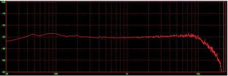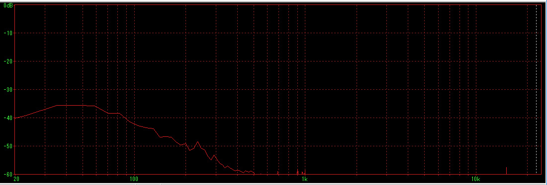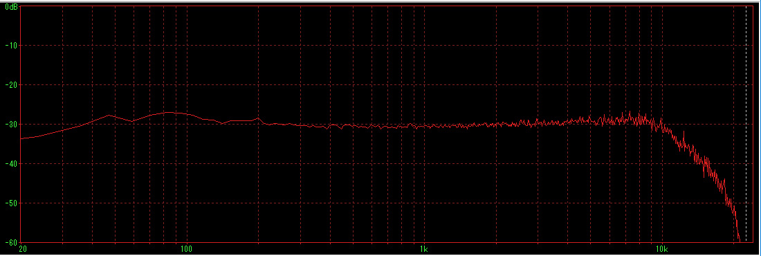 10kHzより先が激落ちしている(笑)。もう少し伸びているかと思ったが、こんなものかもしれない。 低音が強調されているように思ったが、20〜10kHzまでは意外とフラットで優秀である。逆に100Hz以下が20Hzまでさほど落ちていないのはスゴイ。 次に、システムノイズの測定。 |