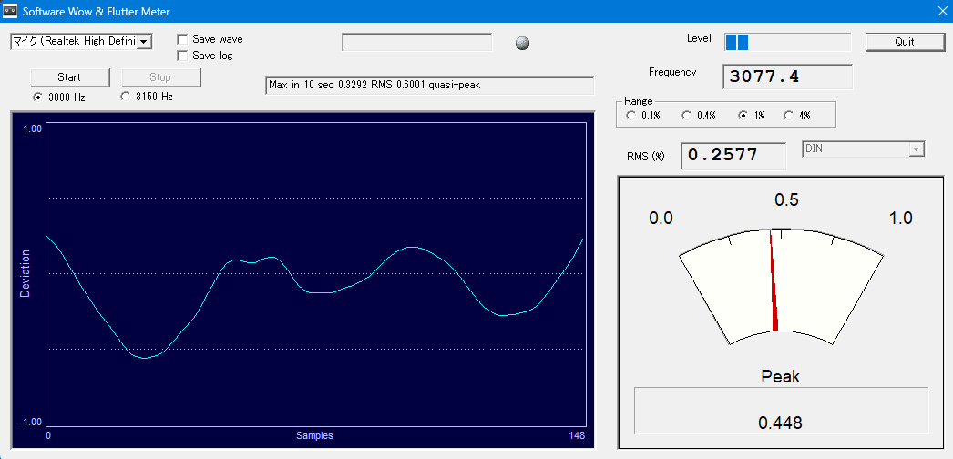 100Hz以下のノイズが結構大きい。測定上は1kHz以上のノイズはほとんど出てこないが、テープ再生時は静音時のノイズが結構気になるレベルである。テープの負荷などによって大きさが変わったりするので、モーターからのノイズが影響しているのかもしれない。 50Hz以下の周波数特性がさほど落ちていなかったのはノイズのおかげだったりして・・・。 最後にワウフラの測定。 本来ならワウフラメーターという機材を使うのだろうが、生憎と所有していないので、パソコンのソフトで測定することにする。 |