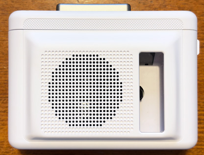 外装は全てプラスチック製で、エッジに丸みを持たせた形状になっている。 ホワイトタイプといっても全体が真っ白ではなく、上下側面はダークグレーのカラーリングになっていてかっこいい。 大きさ的には、Aurexとほぼ同じだが、表・裏にスピーカーやクリップが付いている分、厚みが1センチほど大きくなっている。 全体の丸みの持たせ方がAUREXとは異なり、手になじみやすい形状になっており、滑り止め加工や適度に凹凸があることで片手での取り回しがしやすく、AUREXよりコンパクトな感じがする。。 操作ボタンを上にして立てて使えるというのも使い勝手の良いポイントだ。 また、カセットホルダーを上側に置いて使う場合、下側にクリップがあるのでガタガタと不安定になるかと思ったが、意外と安定している。 使い方を想定したクリップの形状や荷重バランスが考えられているようだ。 |