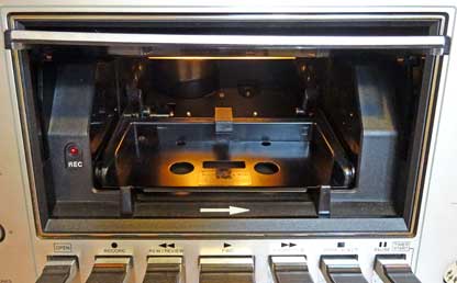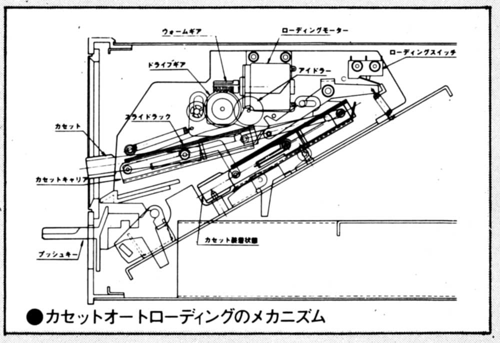 カセットをキャリアに載せた状態でドアを閉めるか又はカセットを少し奥に押すと、ローディング用のモーターのスイッチが入り、その力でキャリアが自動で奥へ移動し、最後にヘッド正面に落とし込まれてカセットをローディングさせるというものである。 落とし込まれる時に、リッド奥の左右にあるレバーがカセットを上から押さえるようになっており、このレバーがカセットをホールドしてがたつきを防ぐ仕組みになっている。 カセットは水平ではなく、奥側が若干高くなるよう斜め30°の角度でセットされ、さらに、リッド内部の上下には照明が付いているので、ローディングされたカセットのラベルやテープの残量確認がしやすくなっている。 |
