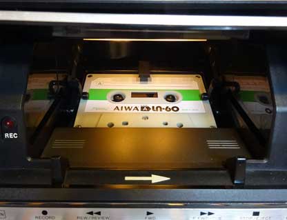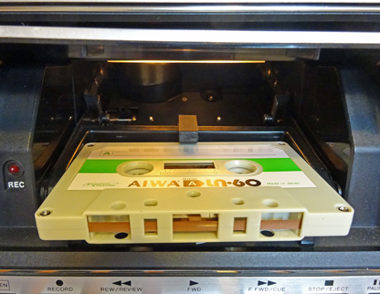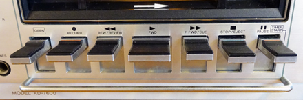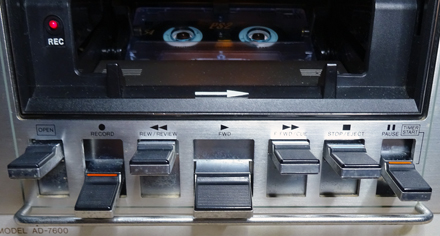 調整を終え、録音を始めるにはポーズボタンを押してポーズを解除する。 録音が開始されるとテープランニングインジケーターの光も左から右に流れ始める。 テープを止めるのはストップボタンであるが、ストップボタンはイジェクトボタンと兼用になっている。 テープが動いている場合はストップボタンとして働き、動いていない場合はイジェクトボタンとして機能するようになっている。 これは、本製品だけではなく、この時代のAIWAのデッキに共通した仕様である。 兼用させると内部の機構がより複雑になると思うのだが、これもボタンの配置やスペースに制約のあるラジカセの設計思想と相通じたものなのかもしれない。 |
