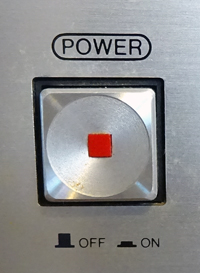 では、実際の操作を始めよう。 まず、電源を入れる。 四角い電源ボタンはパネルの左上にある。表面に円形のくぼみが付いており、指がかりが良い。 なお、中央部分の小さい赤い四角はペイントで、この部分が光ったりする訳ではない(笑)。 |