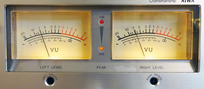 この時代らしく、操作はソフトタッチのボタンではなくピアノキー式のレバーである。 この方式は、レバーのストローク、つまり手動力によって内部の複雑な機構を動かしているため、力を入れて押さないと機能しないものが多い。 しかし、本製品は驚くほど軽い力で動作する。レバーを押し下げて最後にカチッとロックされる直前には引き込まれていくような感じさえするほどである。 この辺は、カセットテレコの経験豊富な同社のノウハウが生きているのだろう。 ところで、写真を見てお気付きかと思うが、操作レバーの下に棒のようなものがある。これは「操作ボタンバー」というものらしい。 SONYのカセットデンスケなど可搬型デッキに取り付けられ、おしゃれな感じもあって一時期ちょっと流行したものだが、据置型でこれが付いているのは珍しい。 可搬型デッキの場合は縦置きや不安定な状態で使う場合も多く、ボタンとバーを2本の指でつまむようにしたほうが力が入れやすく確実に操作ができる。また、屋外使用の際にバーがボタン類をガードするという役割もするのでその存在意義は大きい。 しかし、本製品の場合はどうだろう? 据置型であるし、ボタンは下へ軽く押せばよく、つまんで力を入れる必要はない。操作ボタンをガードする必要性も薄い。 とすると、これは装飾と考えるべきだろうか? さて、録音スタンバイ状態にすると、録音レベルの調整が可能となる。 録音レベルの調整は、レベルメーターを見ながらパネルの右端にある調整ボリュームで行う。 レベルメーターは左右独立したVU型で、目盛りは-20VUから+6VUとなっている。カセットデッキのメーターとしては大型で視認性がよいので、レベル確認がしやすい。 左右メーターの間にはピークレベルインジケーターがある。 インジケーターは3dB(黄・下)と7dB(赤・上)の2ポイントである。 なお、各メーターの下にある穴はメーターアジャスト用である。メーターの0ポイントがずれた場合にドライバーを突っ込んで調整するためのものだが、通常は(と言うか、ほぼデッキが粗大ゴミになるまで1回も)使うことはないので、パネル面の淋しさを補う飾りの要素が大きいのではないかと思う(笑)。 |