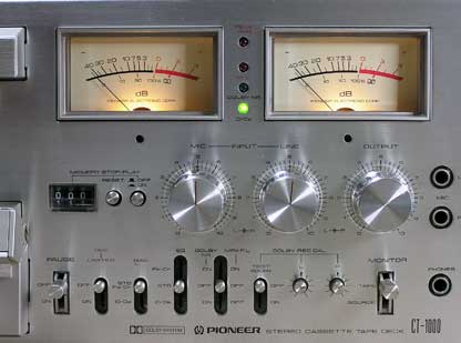 オーディオ機器の総合メーカーであるパイオニアが、満を持して発売した同社初の3ヘッドカセットデッキである。 このデッキの特徴としてまず目を引くのは、その大きさであろう。 通常の他社カセットデッキに較べて高さが1.5倍位ある。 ファンクションスイッチ、メーターやボリュームノブなどもこれまたでかいっ! さらに、余ったパネルの空間を埋めるようにスイッチ類が多数並んでおり、この多機能アピール型のパネルレイアウトは、何ともマニアの心をくすぐる魅力を持っている。 |