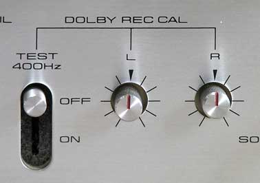 カセットを装着すると一瞬巻き戻しの動作が行われ、テープのたるみを取ってくれる。(「ATLC機構」というのだそうである。) フルオープンローディングのため、カセットは丸見えである。 テープの残量確認が容易であるのは勿論、テープが回転している様子もよく分かり、その様を見ているのも楽しい。 テープだけではなく、ヘッドの動きやポーズ時のピンチローラーの動きもよく分かるような設えになっており、機械の動きを楽しみながら操作をすることができる。 なお、テープ走行中はガイドがロックされ、取り外しはできない。また、カセットがきちんと装着されないとメカが動作しないようになっている。 このデッキには、テープごとにバラツキのある録音感度を微調整するキャリブレーション機能がある。 本来は、ドルビーNRが正常に働くように録音時と再生時のレベルを合わせるためのものであり、、ドルビー非使用時には不要ではあるが、ドルビー使用の有無に限らず調整しておいた方が気分的に良い。(笑) 調整方法は簡単で、テストトーンスイッチをON→モニタースイッチをTAPEに→録音開始→ メーターが0VUを指すようにキャリブレーションボリュームを調整→完了 である。 調整用のボリュームは小さいが、ドライバを使わなくても指で回すことができる。 |