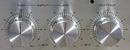 1970年代のデッキらしく、マイクから直接入力が可能で、レベルの調整もLINEとMICが独立しておりミキシングも可能となっている。 出力ボリュームと合わせて3つの大型ボリュームつまみが並んでいるのは壮観である。 各ボリュームは、アッテネーター感覚の41ステップクリック付きというマニアックな仕様となっている。 また、各ボリュームノブの周りには、通常位置の目安となるようメモリーマーカーも付いており、より一層ボリュームノブの大きさを目立たせている。 |