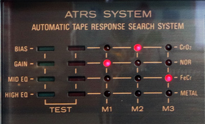 本製品の目玉と言える機能で、いわゆるカセットのオートキャリブレーション機構である。 「ATRS」というのは「Automatic Tape Response Search」の略で、テープのバイアス、感度、録音イコライザーをボタン一つで最適値に自動調整してくれるものである。 調整のフローチャートは、 ↓ テープ感度粗調整(@1kHz) ↓ 録音バイアス調整 ↓ テープ感度再調整 ↓ 録音イコライザー調整(中域、@7kHz) ↓ 録音イコライザー調整(高域、@14kHz) ↓ テープ巻戻し(終了) となっていて、これらを自動でやってくれる。 調整中には、何を調整しているのかが分かるように調整項目の緑のLEDが点灯する。 このデッキの発売は国産のメタルテープが登場し始めた1979年で、まだフェリクロムテープがバリバリ現役の時代だった。 よってこのオートキャリブレーション機能は、「ノーマル」「ハイポジ」「フェリクロム」「メタル」、つまり、TypeTからWまで全てのタイプに対応している。当時としては当然だが、今思うとなかなかに凄いことである。 |