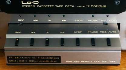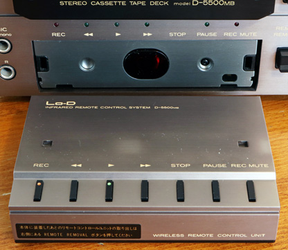 リモコンで操作できるのは録音・再生、早送りなどテープ駆動関係のみである。 写真で分かるように、デッキ本体には操作ボタンがなく、リモコンを外した状態では本体の操作ができなくなってしまうので、リモコンを使わないときは本体に装着しておかないといけない。 リモコンを本体に装着しているときには、リモコンの電源はデッキ本体から供給されるので、本体に装着しっぱなしで使うのであればリモコンに電池を入れておく必要はない。 |