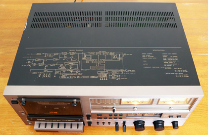 そしてキャビネットのトップカバーには、この時代の高級デッキのお約束とも言えるブロックダイアグラムのプリントがされている。 本製品の場合は、ブロックダイアグラムの右側にさらに製品仕様も印刷されている。 |