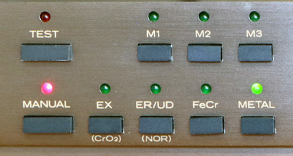 テープを入れたら、使用するカセットのタイプに合わせてテープセレクターのボタンを押す。 タイプを示すセレクターの表示は、一部が一般的な表現とは異なっている。 ハイポジは「EX」と表示されており、これは日立(Lo-D)のハイポジカセットの製品名でTypeUのことである。 また、「ER/UD」というのも同様に製品名で、ノーマルタイプ(TypeT)を示している。 先述したとおり、本製品では「FeCr」(フェリクロム=TypeV)を含む全てのタイプが選べるようになっている。 なお、ボタンの並び順は左から、TypeU、TypeT、TypeV、TypeWとなっており、TとUが一般的な配列とは逆になっているので、いささか戸惑う。これは暗に、常用カセットとしてハイポジを推奨しているのかもしれない。 |