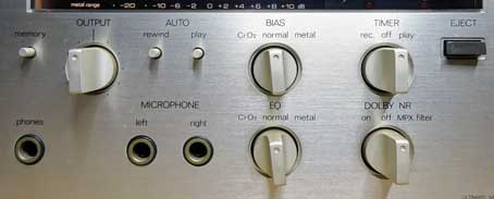 LED表示のメーターは、80年代以降においては普及機でも使われた方式であるが、針式メーターがほとんどであった本製品発売当時においては最先端のものであり、それだけでも斬新で高級感を与えるものであった。 さらに、本製品の場合、目盛やドルビーマークなどは横から別の照明を当てることによって浮き出して見えるようになっており、さらに高級感を高めるデザインとなっている。 よく見ると、このメーターの下の方に「metal range」と書かれた表示がある。 これは、テープセレクタをメタルテープに合わせた場合、メーターの目盛はこちらになりますよ、という意味で、通常(normal/CrO2)テープの場合のメーターの最大目盛は+6dBだが、ダイナミックレンジが大きいメタルテープ使用時には最大表示が+10dBになる。 なお、LEDのセグメント数は変わらないため、メタルの場合、最小目盛が-30dBから-20dBに変わる。まあ、実用的には最大ピークレベルを監視する方が重要なので、これは合理的である。 メーターの下にはスイッチ類がレイアウトされており、回転式と押しボタン式のものが使われている。 |