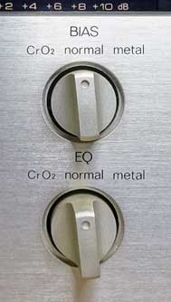 電源スイッチは、パネル右下にある黒くて小さいプッシュスイッチである。 スイッチを押すと、カセットリッド内の照明とメーター部の目盛表示が点灯する。カウンターにも照明が付いている。 カセットリッド左側にあるイジェクトボタンは一般的な感覚からすると若干小さめである。まあ、動作が軽いので、押したときに指が痛くなることはない(笑) ボタンを押すとカセットリッドのドアがスッと開く。 カセットを入れ、ドアを閉める。ガラス製のドアなので、カチャカチャした感じがなく適度な重量感がある。 次に、テープセレクタのスイッチを使用テープに合わせる。 バイアス(BIAS)とイコライザ(EQ)は独立したセレクタスイッチになっている。だが、いずれも「normal」「CrO2」「metal」の3種類だけなので、自ずと組み合わせは決まってしまう。 この辺は、他のメーカーでも同様のものが多い。単に二度手間になっているだけのようには思うのだが(笑)。 |