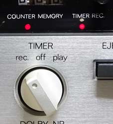 また、いずれも「normal」がセンター配置になっている。 これは、K-12も最上位の5K50も同様なので、ノーマルテープの使用頻度が一番高いと考えてこのようにしたのだと思うが、音質重視のデッキならば「CrO2」をセンターにしてその姿勢を示しても良かったのでは・・・と、若干の残念感が残るセレクタスイッチである。 ドルビースイッチはEQスイッチの右にあり、必要に応じて切り替える。スイッチの形はバイアスやEQと同じである。 そして、ドルビースイッチの上にはタイマーのスイッチがあるのだが、これが、なぜこの位置にあるのか謎である。 多くのデッキでは電源スイッチの近くにあり、操作性を考えてもその方が良いと思うのだが、本製品の場合は恐らくデザインを考えてのことなのだろう。 電源スイッチ近くに配置しようとしたが、デザイン的に収まりが悪かった・・・ということではないかと推測する。 ただ、タイマー録音セット中は、このスイッチの右上(テープカウンターの右下)にある赤いインジケーターランプが点灯するようになっているので、それとの位置関係かも・・・という可能性もあるが、そうだとしたら、タイマースイッチの「rec」と「play」は逆だろーっ、とツッコミを入れたくなる(笑)。 |