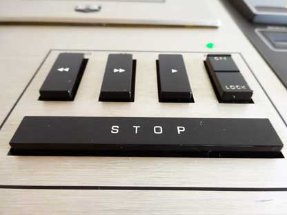 まず電源を入れる。 電源スイッチはパネル面手前、一段低くなっている部分の右にある銀色の四角いボタンである。 電源を入れるとメーターの照明が点灯する。 パネル面の最も左にある黒い「EJECT」ボタンを押すとカセットリッドが勢いよく開く。 リッドとともに内部のカセットベース(受け台)の手前部分も持ち上がる。 カセットテープをベースに載せて下に押すと、カセットはリッド内に固定(ローディング)される。 |