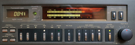 その右の上側には、テープカウンターとレベルメーター、下側には操作ボタンがありこちらもレイアウト的には「M88」と似ているが、本製品のカウンターはデジタル式になっている。レベルメーターの方はFLディスプレイ式というところは同じだが、セグメントの数が圧倒的に多くなっており、この辺はさすがに「M88」の上級機だと思わせる。 |