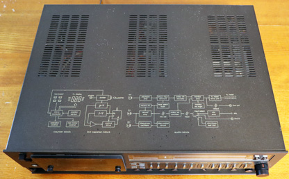 この部分は、透明なガラスのカバーで覆うことができるようになっており、そのカバーは製品に付属していた。 ガラスカバーは両端を化粧ビスで留める仕様なので、着脱はできるのだが結構面倒くさい。 このブロックにはバイアス調整やキャリブレーションのボリューム、ドルビーのON、OFFスイッチなど、デッキ使用時、特に録音時にはほぼ間違いなくアクセスが必要になるものが配置されており、その都度ネジを回して着脱するのはかなりの手間である。 ガラスを壊さないように扱うのにも気を遣うし、カバーをしたとしてもスイッチ類が隠れるわけではないので見た目は変わらないし、ホコリよけが必要というわけでもなさそうなので、結局カバーは外しっ放しにして別の場所にしまっておくということになってしまいそうである(笑)。 ここは、フラッグシップ機らしく、オイルダンプの効いたエレガントなドア式にすれば良かったのにと思う残念な点だ。 説明書によるとこのガラスカバーは、単なる付属品の「飾りふた」としか記載がなく、着脱方法など使い方も示されていない。デッキを使用しない時にふたをしておくためのものというイメージなのかもしれない(笑)。 なお、本製品も「M88」と同様にトップカバーに印刷がされている。「M88」の場合は、ブロックダイヤグラムや周波数特性、日本語のスイッチ説明までが印刷されていたが、本製品はブロックダイヤグラムだけとなっている。 |