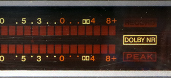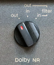 次に、キャリブレーションを行う。 その前に、ドルビースイッチを「out」(=OFF)にしておく。 ドルビースイッチはパネル下部の中央付近にあり、回転レバー式である。 ちなみに、ドルビーを「in」(=ON)にすると、FLメーターの右端に「DOLBY NR」の表示が点灯されるだけではなく、+4dB付近にドルビーマークが現れる。他のデッキでは、ドルビーマークは「ON」「OFF」に関係なく表示されるのが一般的なので、この仕様はなかなかに凝っている。 |