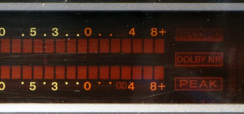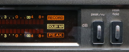 入力切換を再度400Hzにし、テープモニターとソースモニターのレベルが等しくなっているかを確認する。異なっている場合は「rec cal」で調整する。 調整が終わったら、テープを巻戻し、入力切換スイッチを「line」に戻す。 以上でキャリブレーションは終了である。 書き出すと長いが、3ヘッド機で行うバイアスや感度調整としては一般的な作業内容である。 レベルを0dBで調整しているように見えるが、調整しやすいように表示を0dBにしているだけで、実際は-20dBの信号を使っているとのことである。 ということで、キャリブレーションが終わったところで実際の録音に移ろう。 操作ボタンの「rec」を押すとレベルメーターの右端部分に「RECORD」の表示が点灯する。 モニタースイッチを「source」の状態にすると、入力信号のレベルがメーターに表示されるようになる。 メーターはVU又はピークレベルの表示に切り替えが可能で、ピークレベル表示の場合はメーターの右側に「PEAK」と表示される。 |