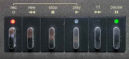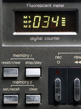 カウンターはテイクアップ側(巻取り側)のリールの回転を検知しているようで、テープの終端近くなると異様に遅くなる(笑)。 このバーグラフが表示されるのは録音または再生時のみで、早送りや巻戻し、停止時は消えている。 また、カウンターの右にある例のグリーンの点滅はカウンターと同期しているわけではなく、一定のタイミングで淡々と点滅を繰り返しているので、これらが並んでいると何だかちぐはぐな感じである(笑)。 テクニクスの最高級機にしてはどうも謎な部分ではあるが、当時は「デジタル」というだけでも先進的なイメージを持たれた時代。こういったデジタルっぽい電子的なギミックが商品アピールとして必要だったのだろう。 なお、表示は若干謎なものの、このカウンターは電子式の2メモリーシステムを備えており、曲の最初と終わりをメモリーしておくと、巻戻しや再生の自動停止をさせることができる機能を持っている。 |