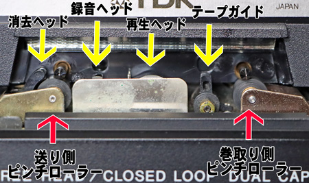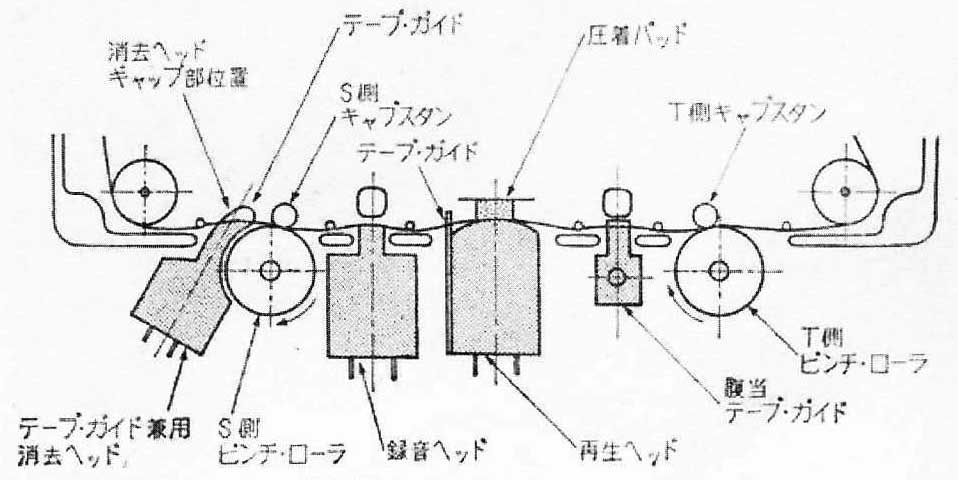 さらに、消去ヘッドは送り側(S側)ピンチローラーの左脇に、テープガイドを兼ねる形状で配置するという何ともアクロバチックな方法をとっている。 |