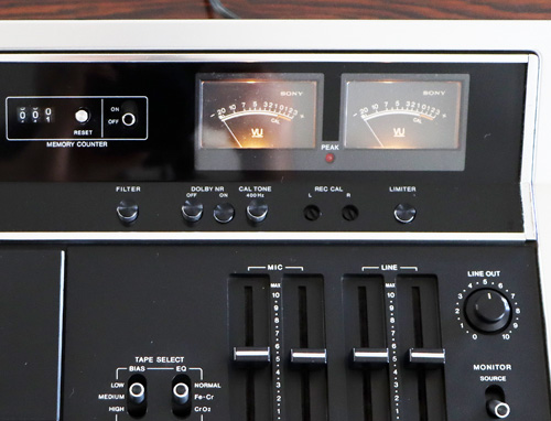 【ライン・マイクのミキシングが可能】 1970年代のデッキはマイクの入力端子が装備されていることが普通で、高級機になるとマイク専用の録音ボリュームも付いていることが多かった。 本製品もその例に違わず、マイク入力ジャックとマイク専用の録音ボリュームが装備され、ラインとマイクのミキシング録音が可能となっている。 また、録音ボリュームには、水平型デッキならではと言えるスライドボリュームが採用されている。 【バイアス・イコライザー各3段切替スイッチ】 テープセレクターはバイアスとイコライザーが独立した切替スイッチとなっており、それぞれ3段の切替えができる。 これにより、当時発売間もなかったフェリクロムテープやクロムテープが適正なバイアス・イコライザーで使用できるほか、ノーマルタイプのテープについてもより適正バイアスに近い設定で使用することができるようになっている。 【複数番組の連続留守録音が可能】 送りボタンや録音ボタンは、通電の有無に関わらず押し込めば機械的にロックされるので、操作ボタンを録音状態にしてタイマーをセットすれば電源ON時のみソレノイドが作動して留守録音ができる。 複数回の電源ON・OFFが可能なプログラムタイマーを使えば、テープの終端まで複数の番組を留守録することが可能である。 【その他】 以上のほか、本製品は当時の最高機種らしく、様々な機能を装備している。 ・メモリー付テープカウンター ・瞬間的な大音量時のひずみを抑える、SONY独自のリミッター録音 ・どのモードでも動作する純電子式オートシャットオフ ・ピークレベルインジケーター ・ラインアウトボリューム ・動作状況を表示するインジケーター 等々、高級デッキにふさわしく、必要な機能はほぼ網羅されていた。 |