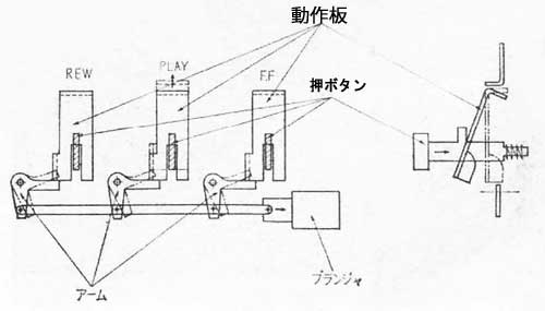(ボタンを押すと、傾斜している動作板が水平になり、プランジャ(ソレノイド)が通電されアームを動かす。アームは水平になった動作板のみに当たるようになっており、その動作板のボタンの操作が行われることになる。また、早送り・巻戻し動作中は送りボタンが押せないようになっている。)