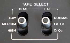 次に、録音の準備に入る。 まず、テープセレクトのスイッチを使用テープに合わせる。 スイッチは、左側の「BIAS」(バイアス)と右側の「EQ」(イコライザー)のスイッチがそれぞれ3段切替できるようになっているが、どう組み合わせてもよいということではなく、テープ種別によってそれぞれのスイッチの設定はほぼ決まっている。 ノーマルポジション(=TypeT)の場合、「EQ」スイッチは「NORMAL」、「BIAS」スイッチは「LOW」又は「MEDIUM」で使う。 「BIAS」の使い分けとしては、「LOW」はTDKやBASF、「MEDIUM」はSONYやmaxellのテープを使う場合に推奨されていた。 当時発売されたばかりで唯一のフェリクロムテープであった「SONY」の「Duad」を使う場合は、「EQ」を「Fe-Cr」、「BIAS」は「MEDIUM」で使う。 クロムテープ(=TypeU)の場合は、「EQ」を「CrO2」、「BIAS」は「HIGH」で使う。これはまさに、TypeUのテープを「ハイポジション」と呼ぶ所以である。 |