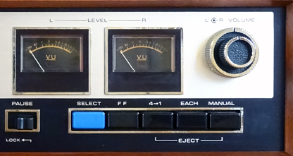 この状態で8トラカートリッジをテープの挿入口に押し込めば、電源がONになってもテープは動かずに「PAUSE」の状態になる。 録音の準備をする場合は録音ポーズの状態にする必要があるので、その場合はパネル左下にある「RECORD」の赤いボタンを押しながらテープを押し込む。 なお、「RECORD」ボタンはテープを差し込んだ後では押せない仕組みになっている。誤操作防止のためだろう。 「RECORD」ボタンは中のスプリングが強いためか押し込むのは結構な力が必要である。 テープを押し込むのも力が必要なので、両方押すとデッキが動いてしまう(笑)。 よって、録音ポーズにする際は、左手の親指で「RECORD」ボタンを押しながら、他の指でデッキ本体が動かないように押さえるというワザを使う必要がある(笑)。 録音ポーズの状態になると、左右のレベルメーターの照明が赤く点灯する。 メーター内のインジケーターだけが赤くなるのではなく、メーター照明自体が赤色なので、分かりやすいが若干異様な雰囲気である。 |