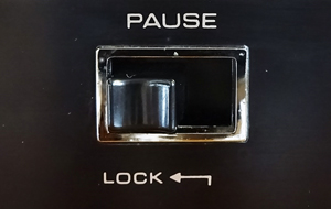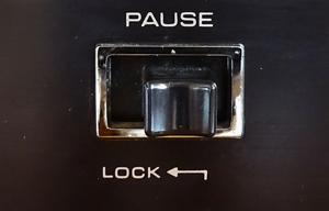 この「PAUSE」ボタンは、押し込みながら左にスライドさせるとロックするようになっているので、カートリッジを差し込む前に「PAUSE」をロック状態にしておく。 |