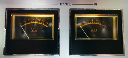 ちなみに、本製品のメーター照明は、電源がONになっても再生状態では何も点灯しない。勿論、メーター自体は再生時でも動作するのだが、周囲が暗いとメーターの表示は全く分からない(笑)。 メーターの目的は録音レベルをチェックするためのもの、という考えなのかも知れないが、「電源ON=メーター照明点灯」という一般的なデッキの仕様とは違うため、照明ランプが切れているような違和感がある。 それにしても、赤の照明というのは、「録音中」という感じは良く伝わるのだが、針の表示がちょっと見づらい(笑)。 余談だが、当博物館所蔵の画像のデッキは、電源ONに連動して電球色のLEDがメーターを照らすように改造してあるので、再生中も違和感がない(笑)。 |
