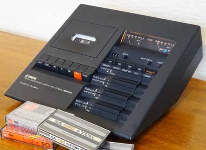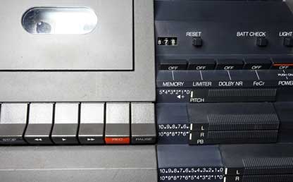 本製品は、この時代のデッキらしく、また、アウトドアでの生録に対応しているということもあってマイク入力が付いており、ライン入力とのミキシングも可能になっている。 また、ドルビーNRを使う場合はドルビースイッチを押し下げる。すると、左右メーターの間にある「DOLBY」の青い表示が点灯する。 録音レベル調整が済んだら、録音をスタートさせる。 既に押し下げてある「REC」キーが戻らないように押さえながら、送りキーを押し込む。 なお、2ヘッドデッキなので、録音同時再生モニターはできない。 ところで、先にも述べたとおり本製品は3電源方式で、ACアダプター(カーバッテリー)や乾電池でも動作させることができる。 当然、電源のない屋外での使用を想定しているのだが、本体重量が5s(電池を入れると5.5sくらい)もあり、キャリングハンドルのようなものも付いていないので、ちょいと片手で持ち歩くという使い方は難しい。 一応キャリングケースも別売されていたようだが、これだけ重くて大きいと、カセットデンスケのように肩に掛ながら使うという感じではない。 もっぱら、電源のない屋外の録音現場に据え置いて使うということを想定しているのかもしれない。 電池で使う場合は、本体の裏側にあるバッテリーケースに単二の乾電池を9本入れる。 |